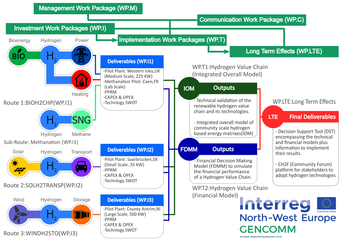 The GenComm project will address the energy sustainability challenges of distant communities across North-West Europe (NWE) through the implementation of hydrogen production and storage using renewable energy sources. Three hydrogen technology pilot plants will be developed, utilizing the three main NWE renewable energy sources (wind, solar and bio) to cover the local heat, power, transport and storage demand. Based on these pilot plants, technical and financial models will be developed, leading into a Decision Support Tool (DST). The DST will pave the way for energy security in remote European communities.